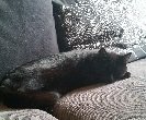 Sort, korthåret hunnkatt. Har en bitteliten hvit flekk under haka (nesten ikke synlig).
