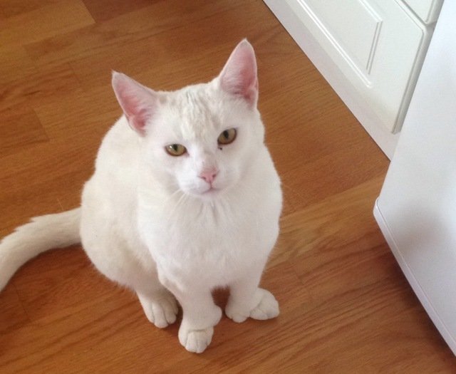 Nusse er en helt hvit skipskatt med seks tær på forpotene. Grønne øyer. Slank og fin. Den er i alderen av 9 år og har ikke chip