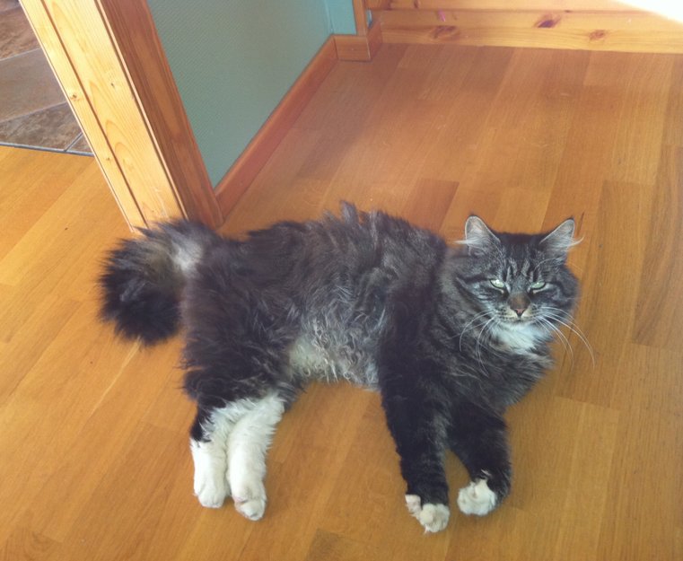 Stor kastrert hannkatt. Glad i kos og oppmerksomhet. Han har hvit pels på magen og hvitt på potene. Også litt hvit på haken og i baken. Lang pels, litt bustete. Han er ikke så glad i å være ute