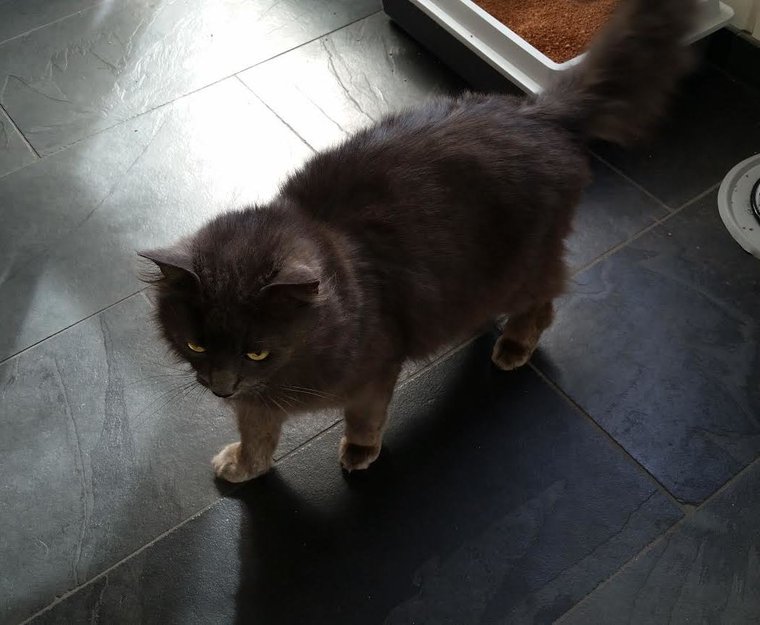 Han har veldig tykk pels nesten som ull, er litt forskjellige grånyanser i pelsen. Han har et arr over venstre øye etter en slosskamp med ukjent dyr for 2 år siden. Han blir veldig plaget av flått pga pelsen og vi fjerner daglig mange flått fra han. Han er ikke veldig kosete, kos skjer på hans premisser. Veldig glad i mat og fanger stadig mat ute også.