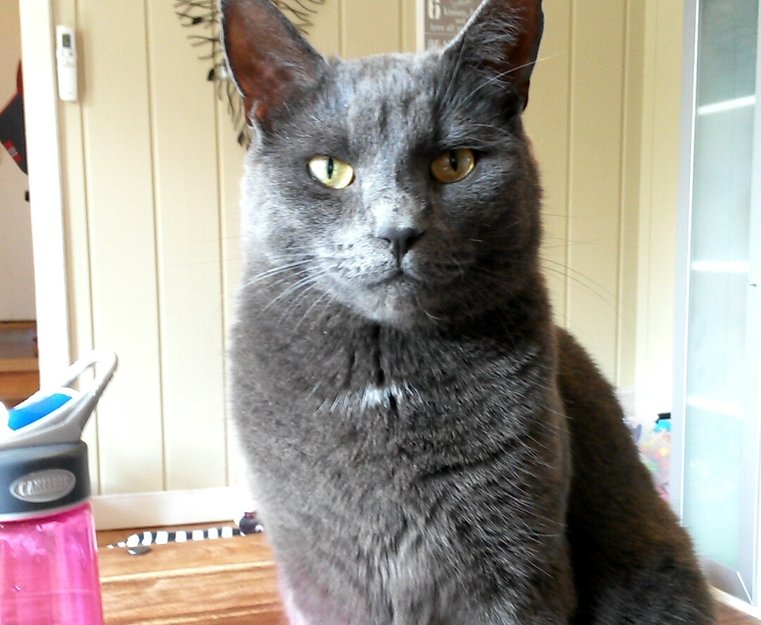 Han har en hvit flekk på brystet, og har et rift i det ene øret. Han er ganske stor (rundt 5 kg) og et lite arr litt over snuta.
