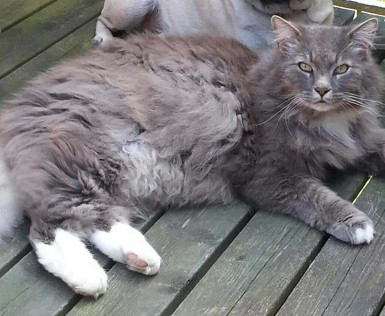 Hvit på bryst og bakpoter (+litt hvit på frampotene).