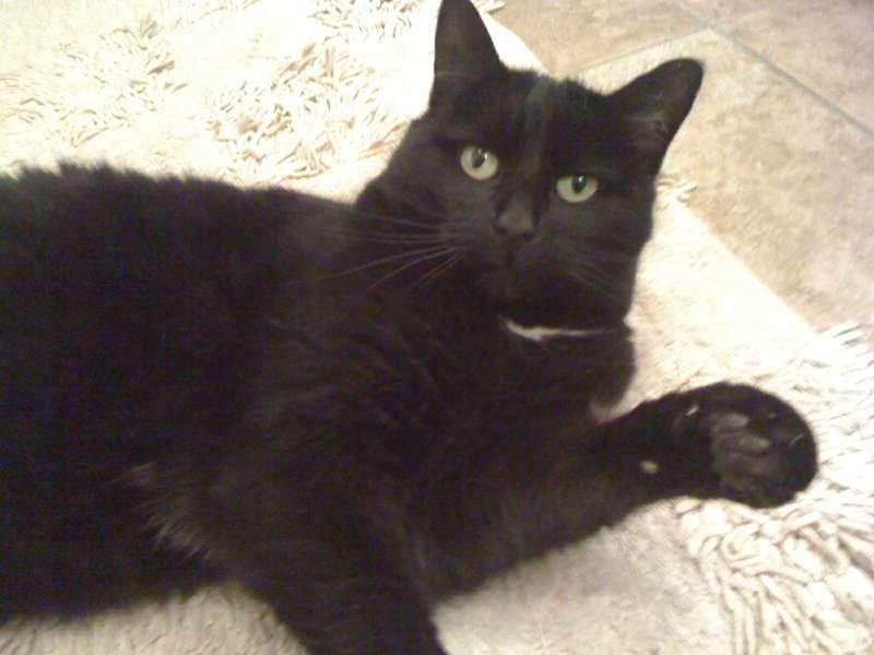 Helt svart katt med litt hvitt på halsen og mageområdet. Pelsen på magen hennes henger en del.