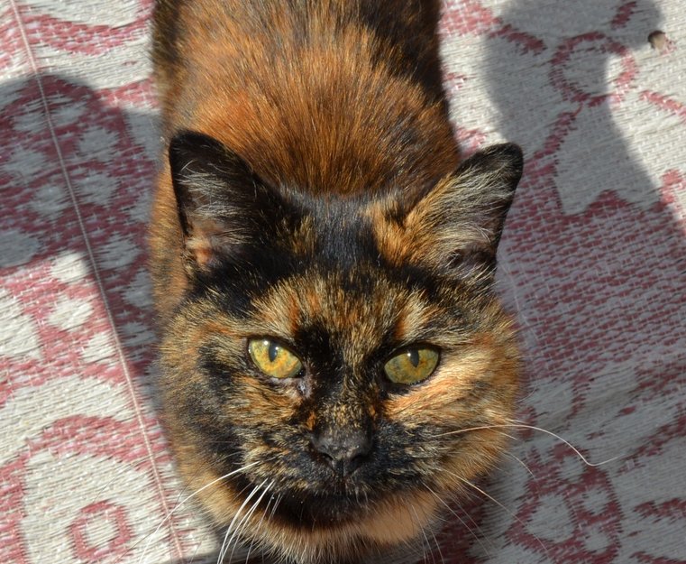 En skilpaddefarget hunkatt holder til rundt huset her. Veldig uredd og kjælen. Virker som den har vært ute en stund.