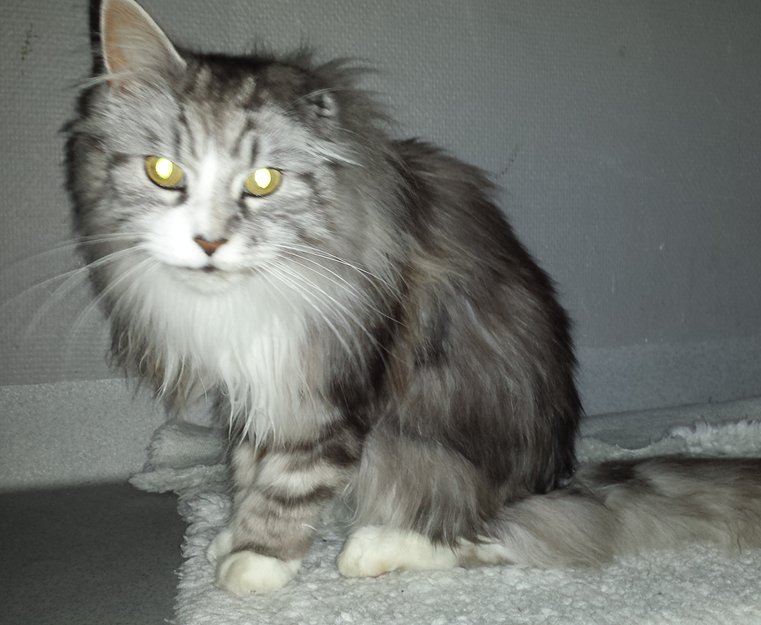 En liten katt med mye päls. Halen är tjock og lång. Vit på bröst, nos og poter annars grå/beig på resten av kroppen.