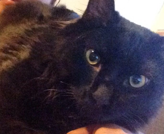 Svart, langhåret katt, med en hvit prikk i manken. Grålige partier under "armhulene".