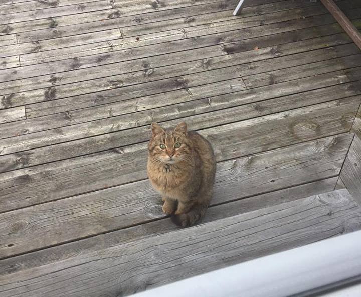 Denne katten har oppholdt seg i området rundt Amalie Skramsgate på Hinna i perioder over lengre tid. Den oppholder seg over et større område, men vender ofte tilbake til vår hage. Det kan gå flere uker mellom hver gang vi ser den, det er derfor vi er usikker på om den faktisk har et hjem.