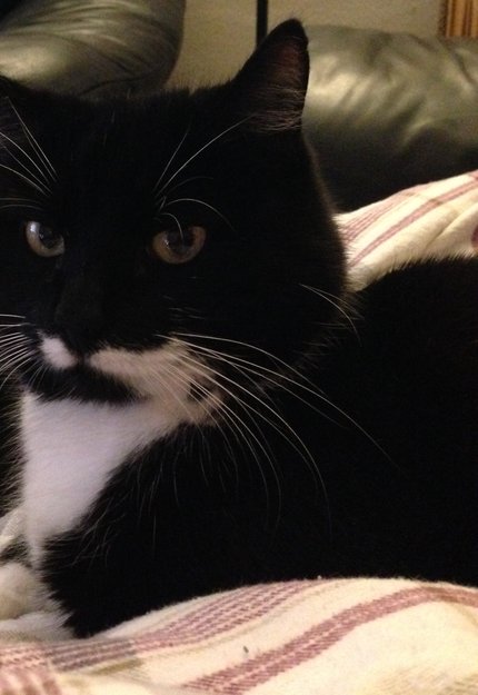 sort med hvite flekker. ser cola farget ut i sola. litt hengehud på magen. litt sky men kosete etterhvert. kan bite hvis klappet på mage og bakre del av rygg. litt små ører i forhold til resten.