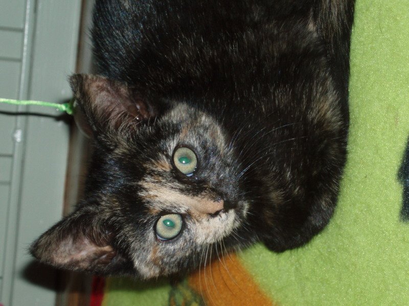 Hun er mørk i pelsen med brune spetter. Er "delt" i ansiktet. Mørk på ene siden av nesen og lys brun på andre siden. Har en lyse brun bakfot. de andre føttene er mørke.