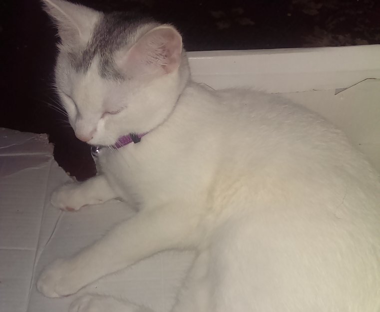 Hun har en helt hvit kropp med en mørk krone på hodet. denne kronen er både grå, brun og litt sort helt øverst bak ørene. Hun har et rosa halsbånd med nummeret mitt skrevet inni.