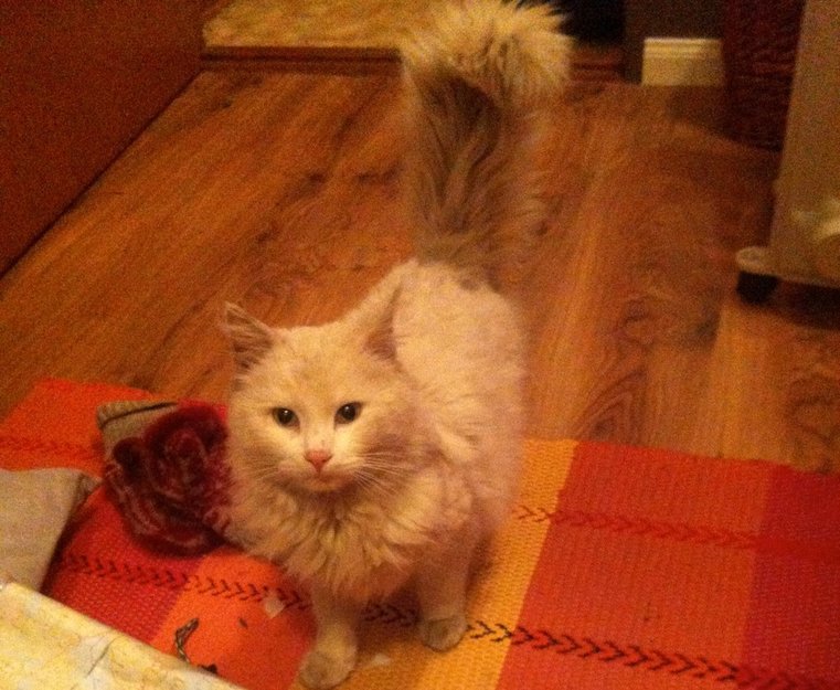 Han er ukastrert og helt hvit over hele pelsen. Han maler fryktelig høyt når han koser seg, høres nesten ut som en båtmotor. Bildet er fra da vi tok han inn, han er frisk og ren nå og kan være veldig leken og kosete. Vi tror han kan være ca 2 år.