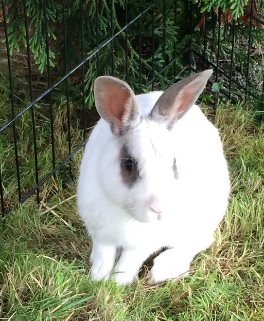 Nydelig hvit kanin med grått rundt øynene og på ørene.