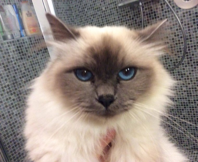 Lys pels, grått ansikt, blå øyne. Lys mjauing. Sitter ofte stille og kikker.