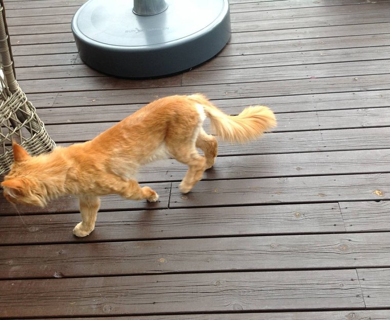 Løvefarget, barbert hankatt har vandret på Ormåsen siden starten av juli. Han virker sulteforet, men er veldig kjælen.