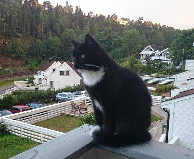 Svart katt med hvitt bryst, hvite poter og hvit haletupp. Katten er hjemmekjær, men redd for fremmede. Dersom du ser katten, ring oss gjerne.