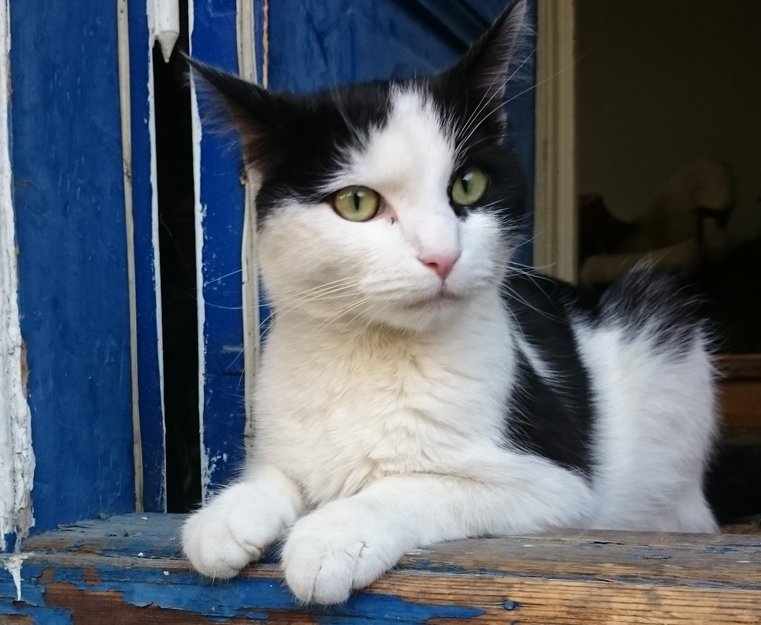 Liten og slank ungkatt på ca ett år. Begge ørene og venstre øye er dekket av sort pels, mens resten av ansiktet er hvitt. Han har mye sort på ryggen og halen. Bryst, mage og bein er hvite.