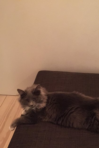 Langhåret grå med hvit bryst og mage . Litt kort og veldig bustete hale:-)