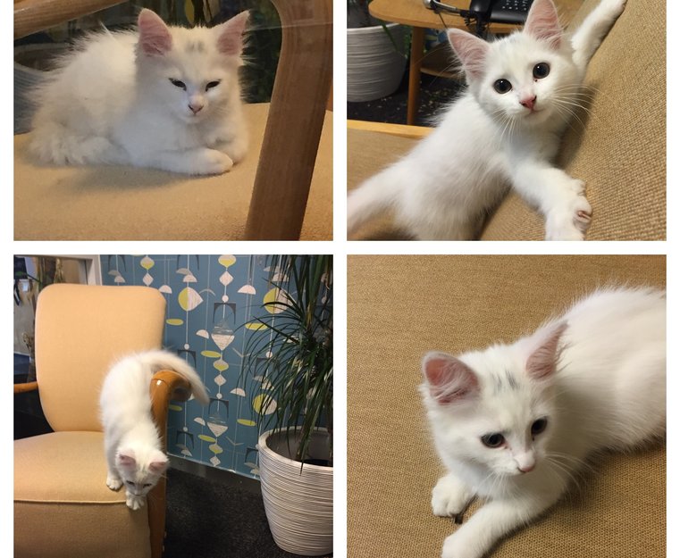 Katten, som heter Snøhvit, var savnet fra hjemmet siden i går. Den diltet etter en kollega i morges, og ville tydelig ha hjelp. Hun tok den med til kulturavdelingen i NRK, hvor den fikk behørig pleie og omsorg. På vei hjem, dukket det opp en plakat om savnet kattunge, det vidte seg å være Snøhvit, som da ble lykkelig gjenforent med sin familie.