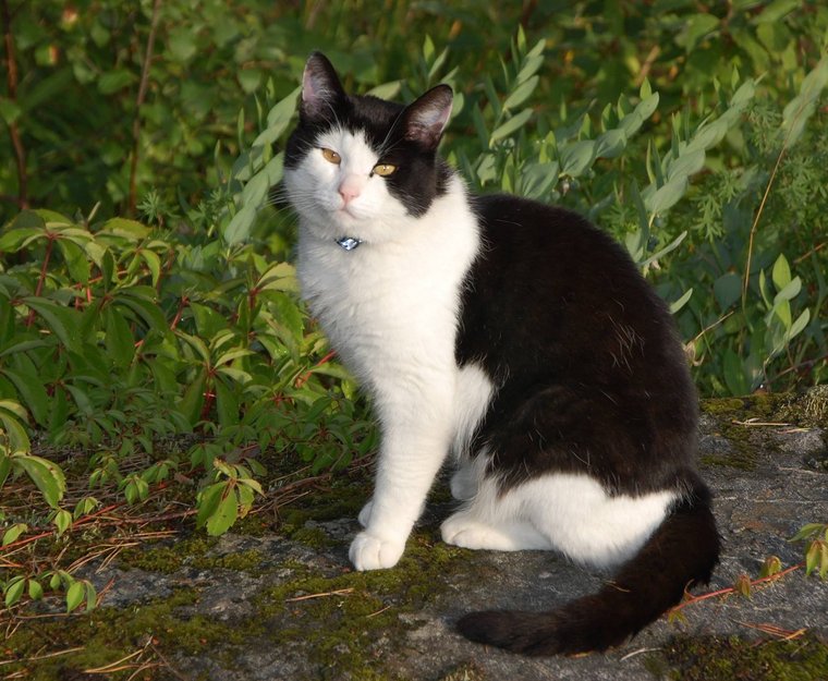 Sinus er svart på ryggen og hvit på magen, med svart pels ved det ene øyet og hvit ved det andre. Han har spetter av "grå" hår i den svarte pelsen. Han er litt sjenert, men kommer gjerne og hilser på hvis han er trygg. Dusør utloves. Telefon: 92082884