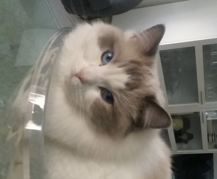 Hvit med grå/beige maske og flekker samt blå øyne.