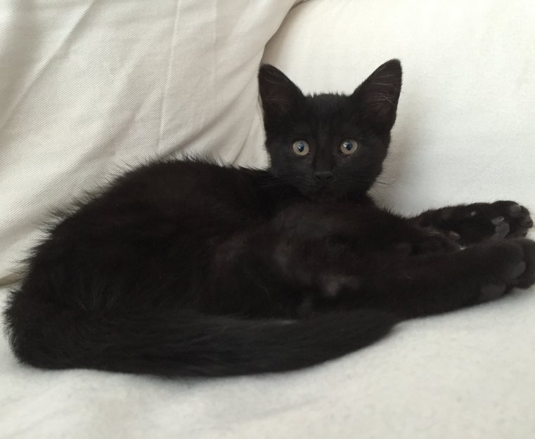 Liten kattunge, helt sort, kort hår. Hun har gule øyne. Menneskesky. Har et sår på venste øyne som heles, og et sår på høyre øye som heles. Hun har rosa halsbånd på seg, men den er bittelitt for stor og den kan ha hengt seg fast i noe og løsnet.