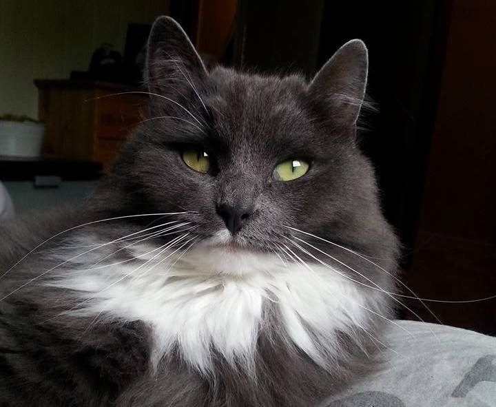 Hvit på brystet og har hvite sokker. Ellers mørk grå. litt skeptisk på nye mennesker men svært kosette. Lang mjuk pels og hun har hvite lange værhår på den ene siden og mørke på den andre siden over øynene.