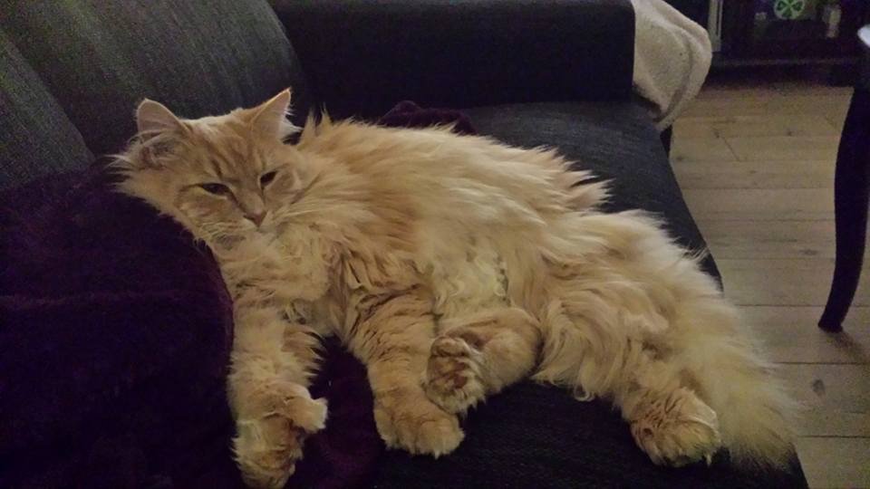 Simba var med på Moysand familiecamping og blei skremt og tok salto ut av selen sin og forsvant til skogs. Simba er en veldig forsiktig pus når det kommer til folk han ikke kjenner, men blir han kjent så er han en stor kosegutt. Han er semilanghåret med hvit under pels og lysebrun overpels. Han er hvit på brystkasse fra snuta og ned og under magen. Og han har hvite lange hår i ørene. Han har også 6 klør pr pote. Han har en hvit flekk oppe på nesa si. Han er nå 8 år gammel