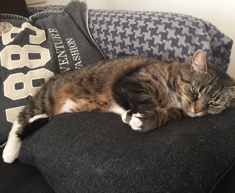 Barbro er tabbet/tigrete.Hun er ganske sky av seg,så ikke lett å få tak i sannsynligvis .Hun er chipet , øremerket og sterilisert.Hun hadde halsbånd