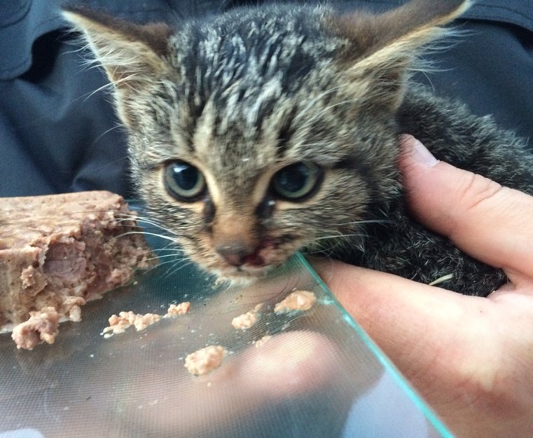 Liten kattunge uten halsbånd eller merker. Den er veldig sky