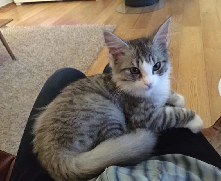Grå og hvit spreglete. Hvitt felt på halsen.