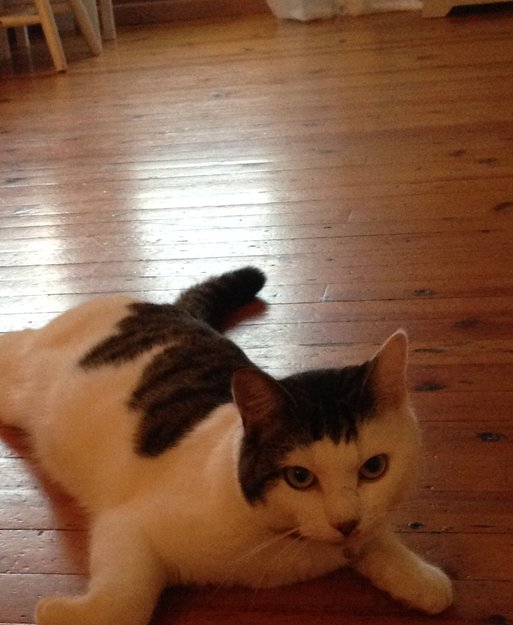 Gråspraglet flekk på hake og hals, ett hvitt og ett spraglet øre. Arr på nese. Veldig sosial.