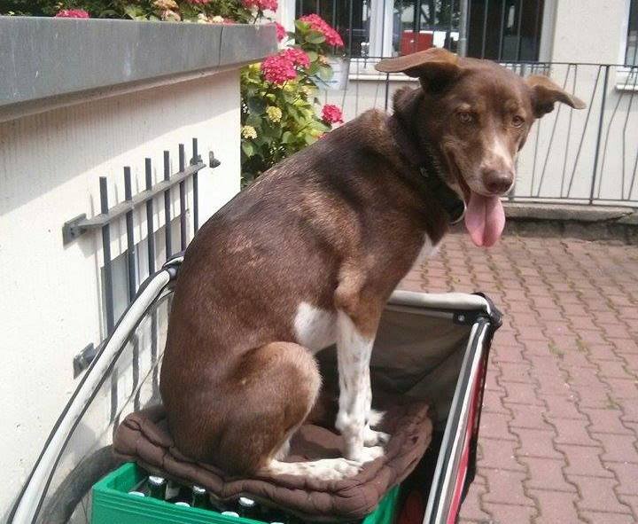 Hun har en halsbånd med en tysk telefonnummer som stikning på og en Tasso merke (liten metal plakett) og en liten container.