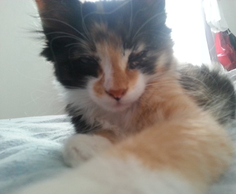 Litt lang å slank kropp, hårfarge hennes er i tre farger - lysebrun, mørkebrun og hvit. Henne er ca 2 år gammel og Er vanelig skeptisk på andre mennesker som kommer bort til henne, henne har ikke chip eller halsbånd på seg.