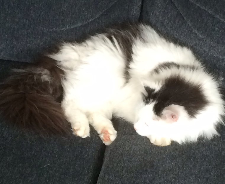 Svart langhåret hale, svart flekk på hodet .hvite ører