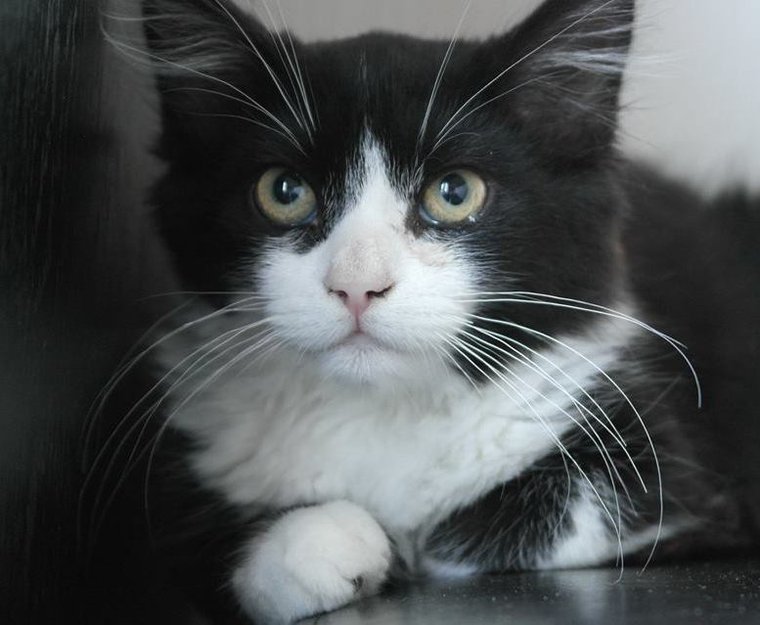 Svart katt med hvite føtter og mage. Langhåret. Stor og tykk hale. Noe redd for fremmede mennesker.