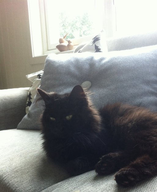 Svart langhåret skipskatt. "Tuster" i ørene. Store poter.