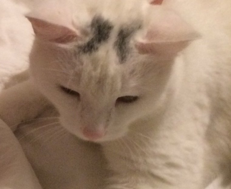 Hvit med to svarte merker på hodet. Er sky og nervøs. Han er 2 år, og en del større en det kan se ut til på bildet.