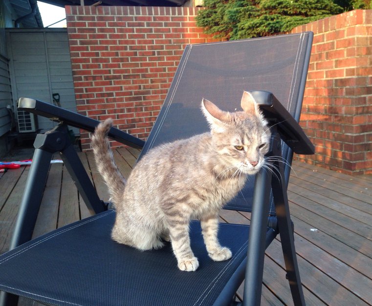 Katten ble oppdaget på let etter mat. Vi hadde satt ut mat til vår egen katt, da vi hadde vært bortreist. Den virket mager og ikke fullvoksen. Ser ut til at den ikke vet hvor den hører hjemme.