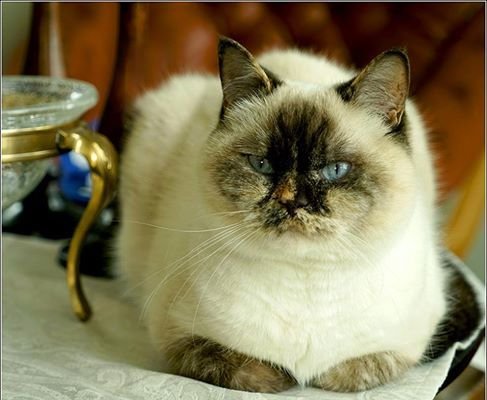 Veldig blå øyne, brune labber og brune tegninger i ansikt og ører