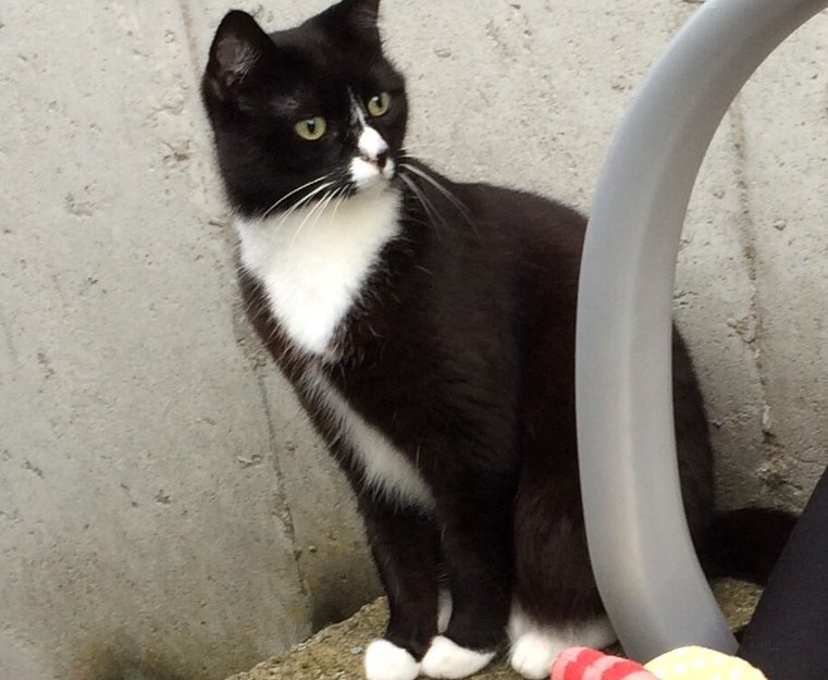 Svart katt med hvite "sokker", bryst og snute. Hun er liten (ca 4 kilo).