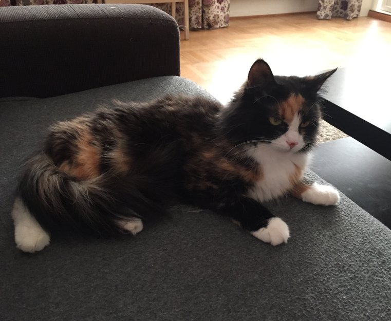 Lizzi har lang, myk pels. Veldig fyldig pels på halen. Hun er ganske lett, ser tyngre ut enn hun er.
