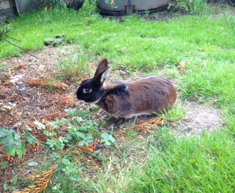 Kaninen var i hagen i ettermiddag. Hodet er svart og kroppen er brun. Den er tam