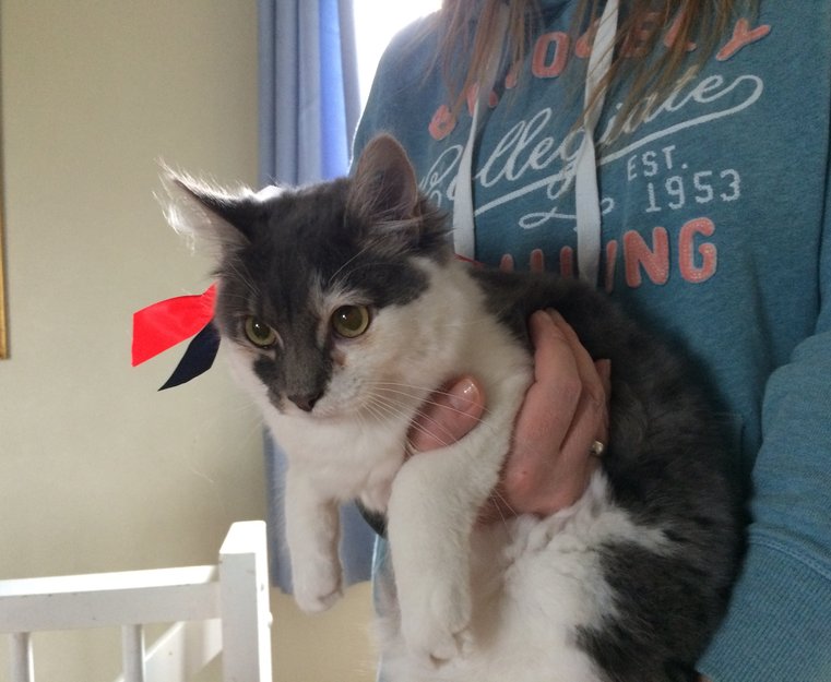 Har blått halsbånd m/tlf nr. Grå oppå, hvit under. Grå buskete hale. Rennende øyne pga tette tårekanaler.
