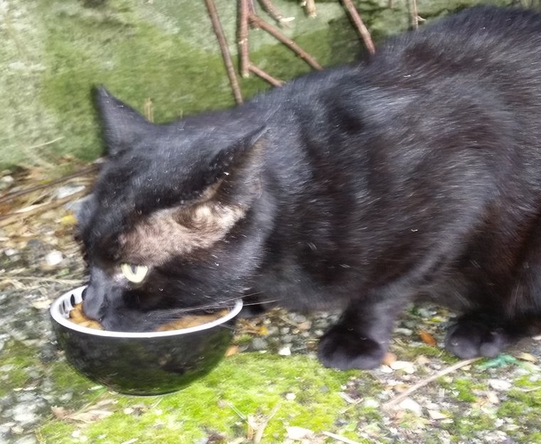 Helsort, kort pels. Litt sky men lar seg klappe og stelles litt ved mating. Ukastert og tynn. (Blir nå matet fast her hos oss.