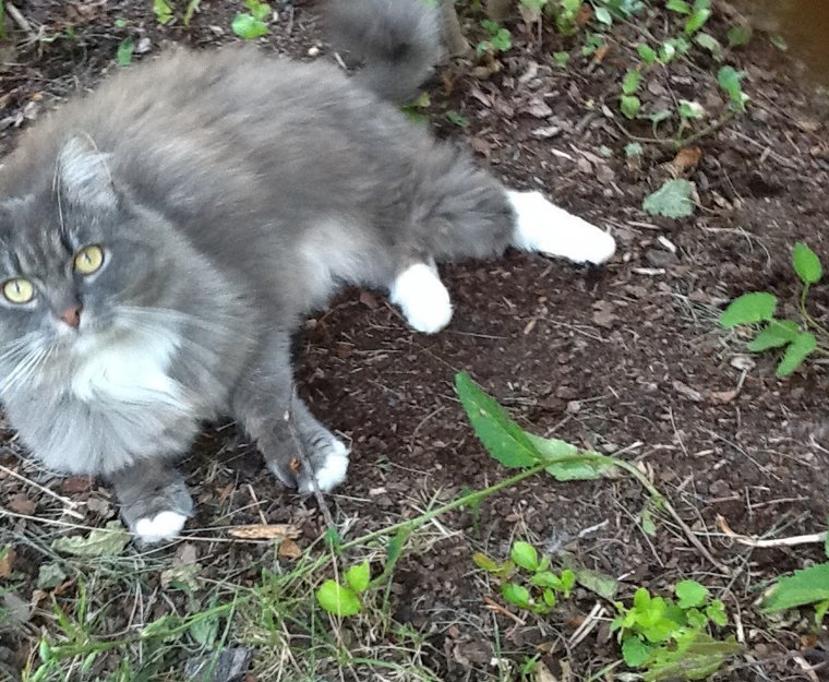 Prater mye. Potene er hvite og hvit under brystet. Fornøy og glad katt.