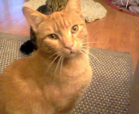 3 år gammel hannkatt, slank og kastrert. Oransje pels svakt tabbymønster. Gule øyne og svarte prikker på nesen.