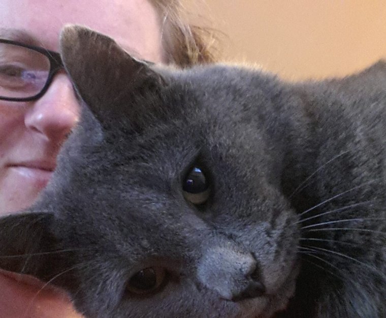 Han er helt grå ( ligner en engelsk blå) og gule øyne og kort håret.