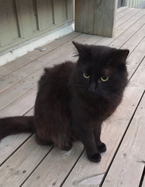 Denne pusen har lusket rundt huset i en ukes tid. Var først veldig sky, men etter å ha fått litt mat ble den også veldig kosesyk og pratsom. Virker som om den har gått uten mat en stund, er tynn og hev seg over maten med stor iver.