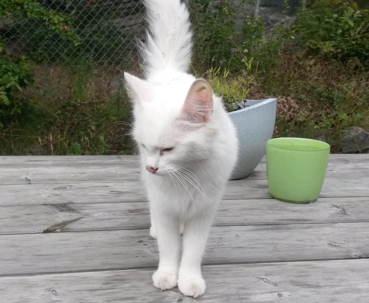 Helhvit (ensfarget) har vandret rundt i nærområdet i 2-3 uker (det vi hart observert etter at min datter oppdaget den). Tynn (stadig tynnere) og veldig søkende etter oppmerksomhet, kos og mat