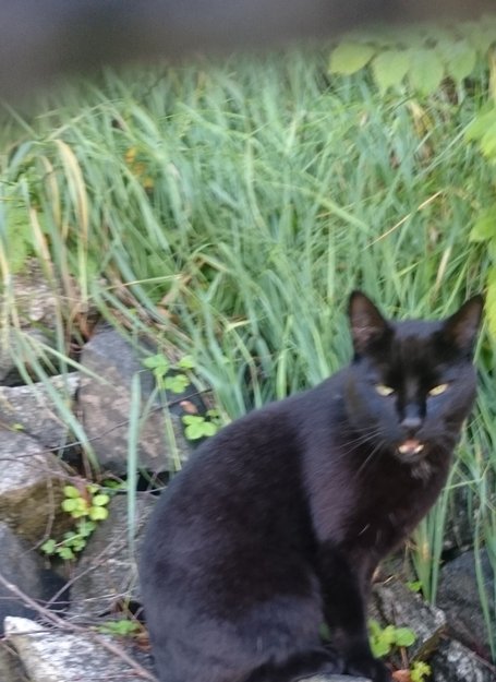 Helt svart med noe hvitt på halsen. Middels stor katt. Kan ikke se at den har id-merke i øret.